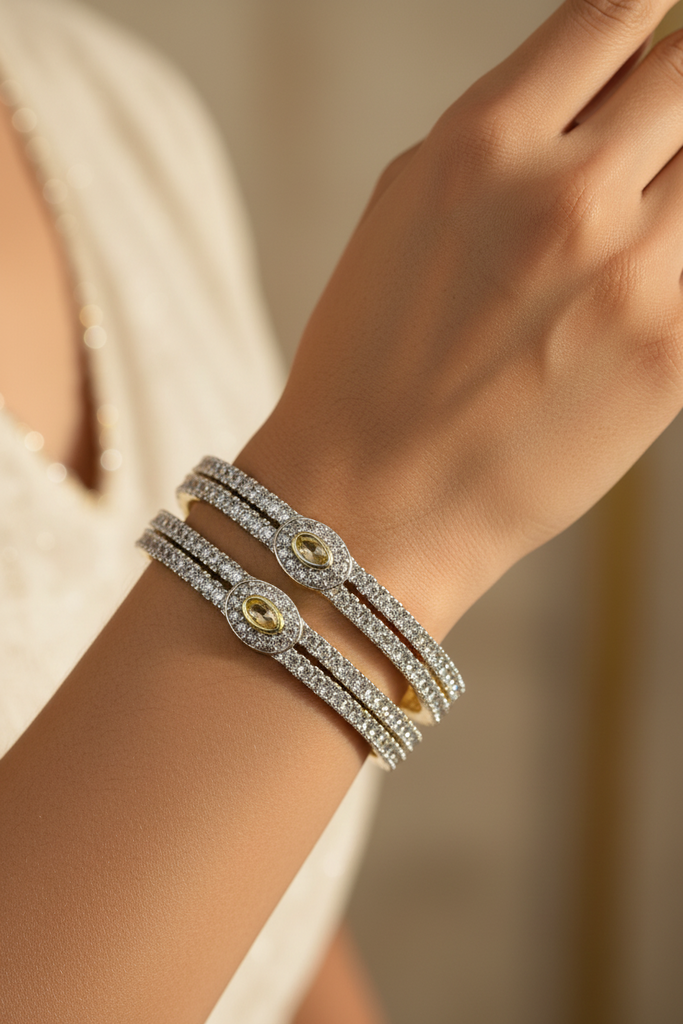 High quality gold + rhodium plated bangles (pair) studded with precious zircons and stones.