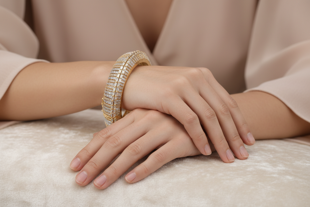 High gold + quality rhodium very elegant and beautiful openable bangle in Rose Gold Polish studded with precious zircons.