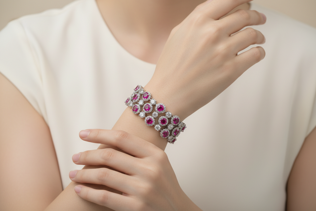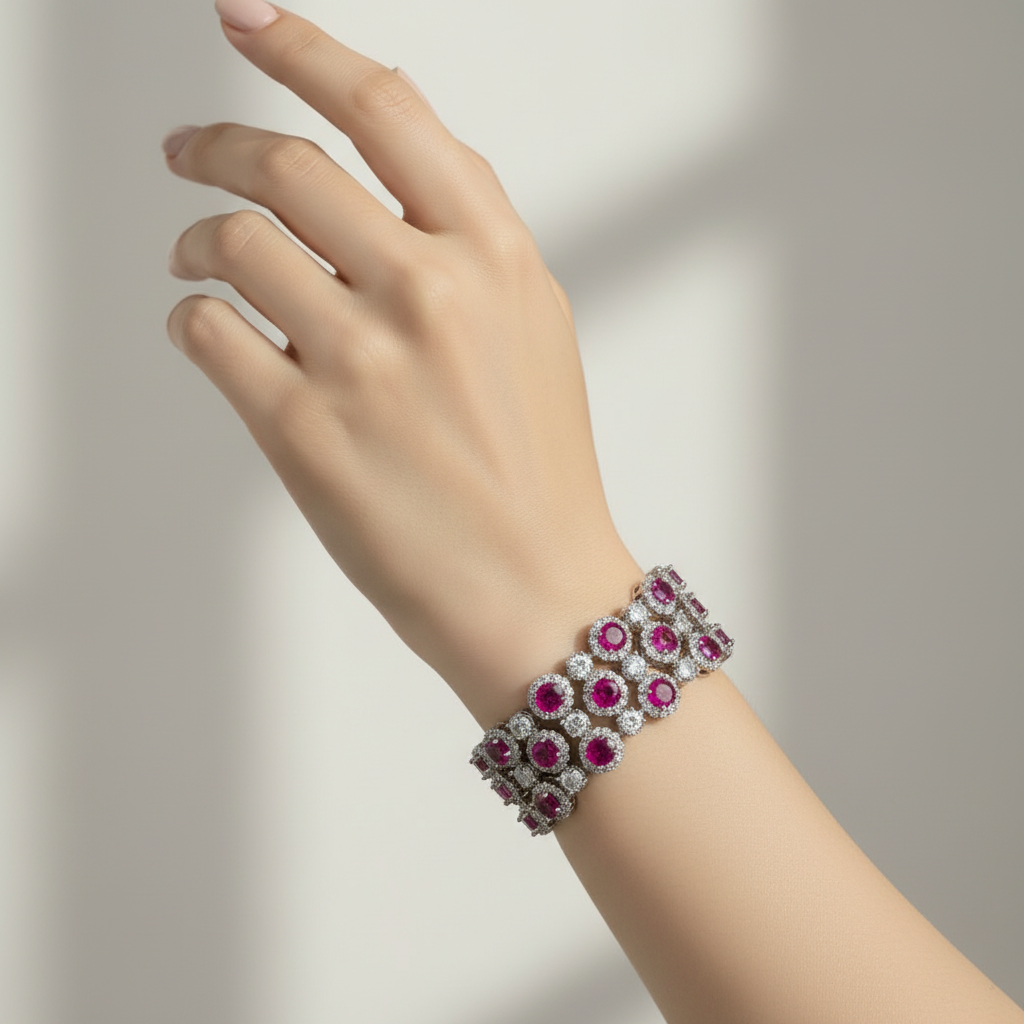 High Quality Rhodium Plated loose bracelet studded with real precious micro zircons and real ruby light tourmaline stones.Premium quality👌