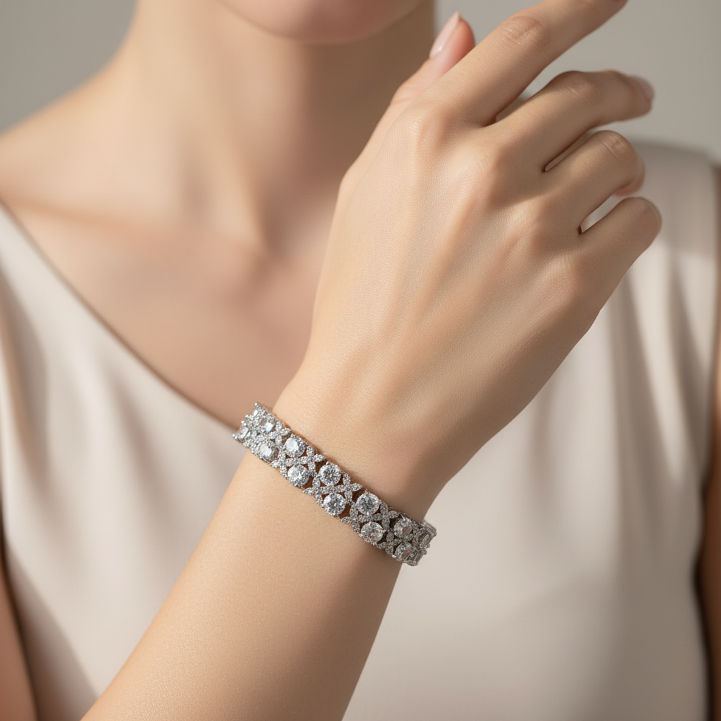 High Quality Rhodium Plated loose bracelet studded with real precious micro zircons and real stones. Premium quality👌