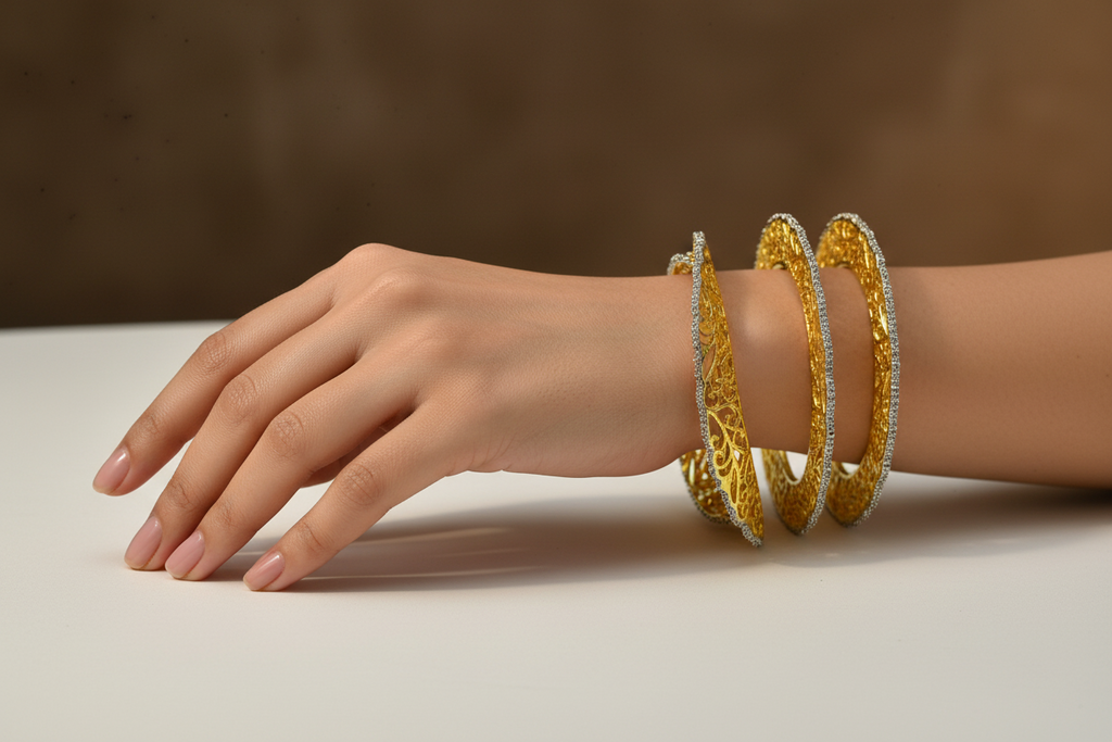 High quality gold + rhodium plated bangles (pair) studded with precious zircons.