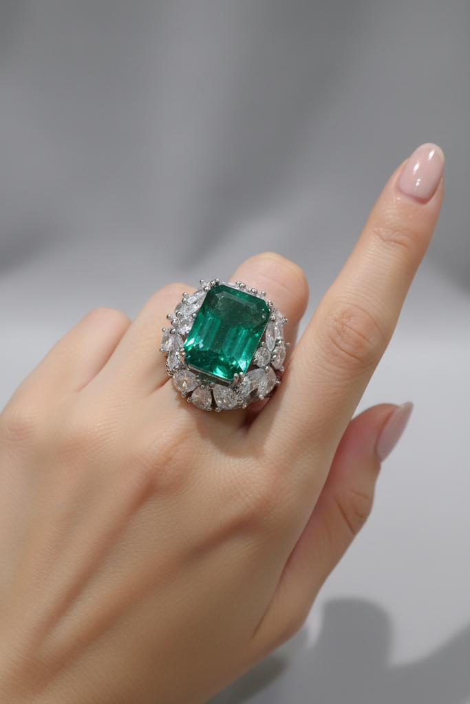 High quality rodhium plated double casted adjustable ring studded with precious zircons and real gilson emerald stone