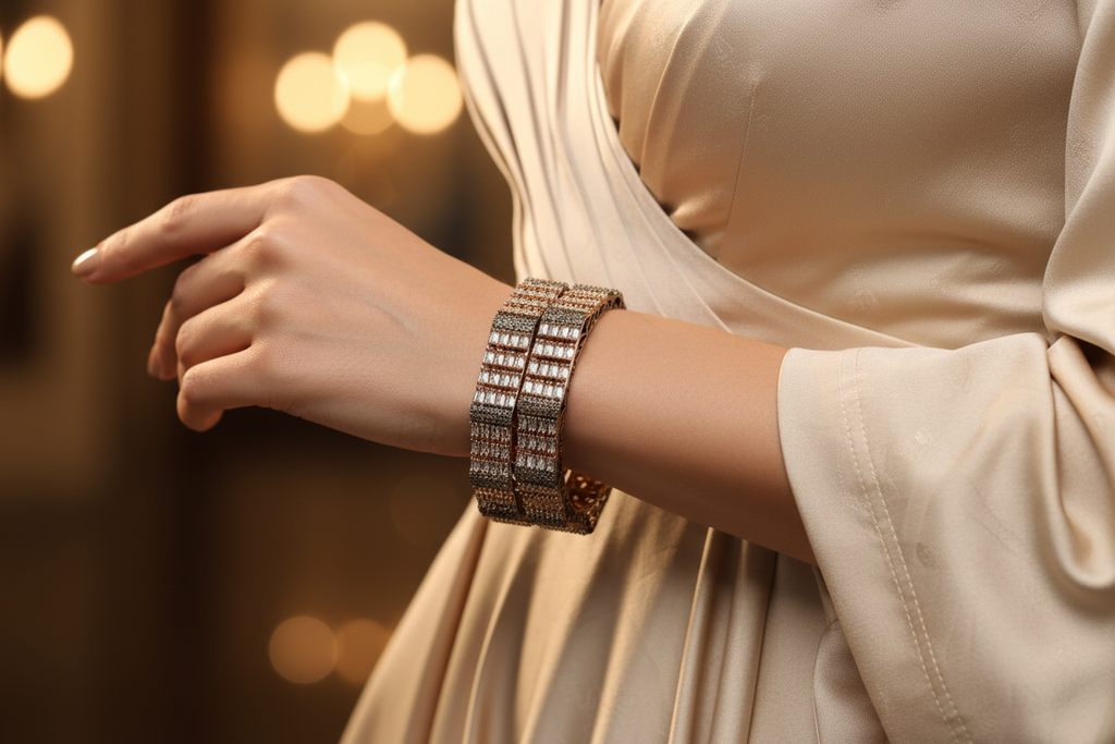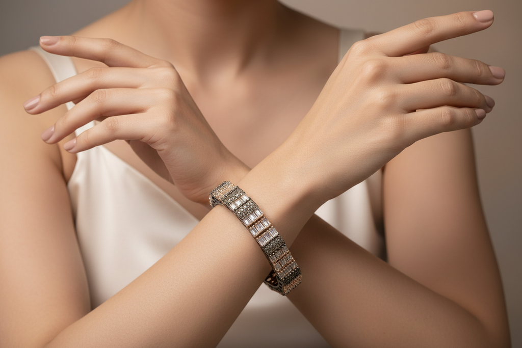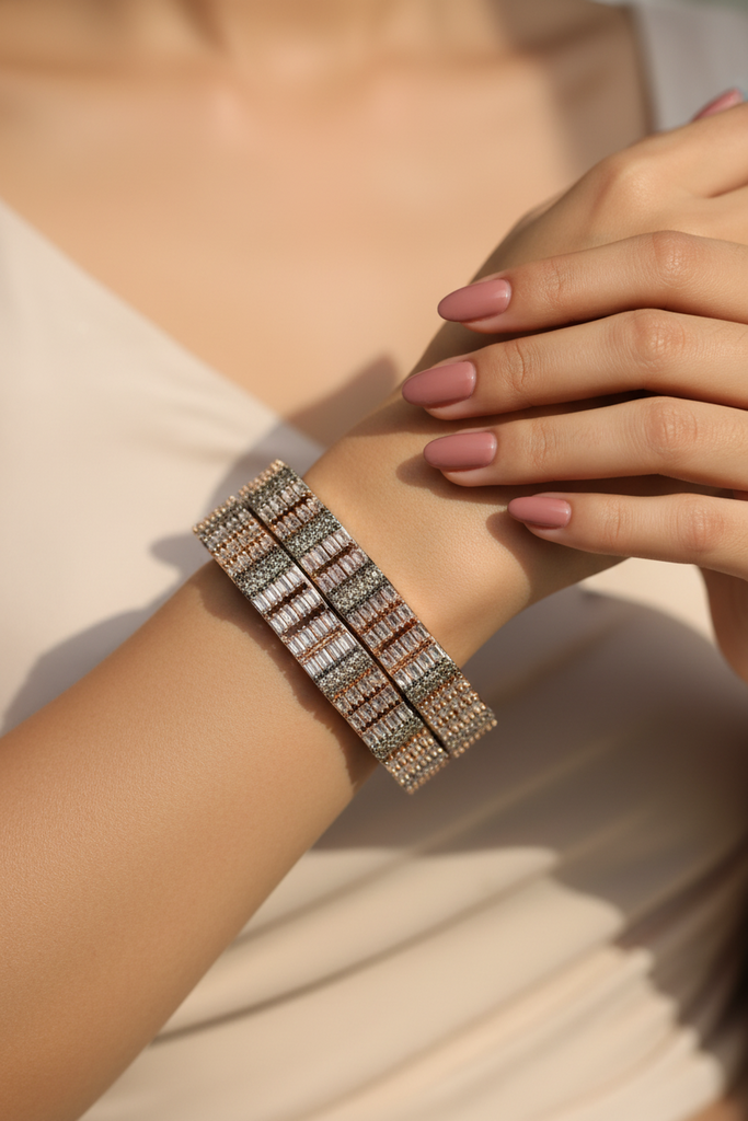 High quality rhodium plated bangle  studded with precious zircons and real stones.