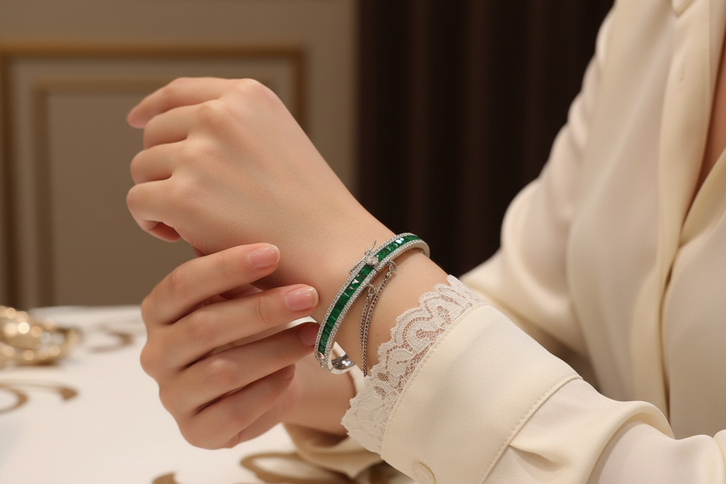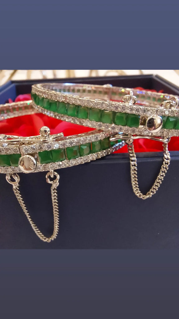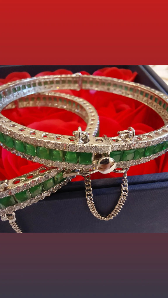 High quality rodhium plated very beautiful operable diamond look bangle studded with real precious zircons and real emerald stones