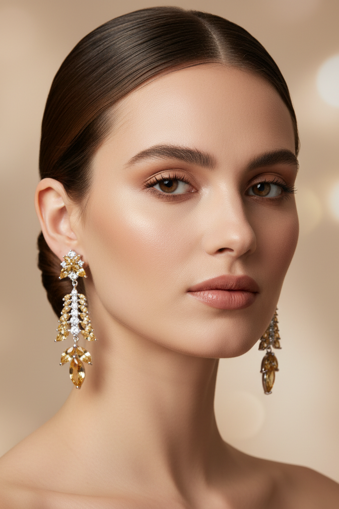 High quality rhodium plated earrings studded with precious zircons and stones.