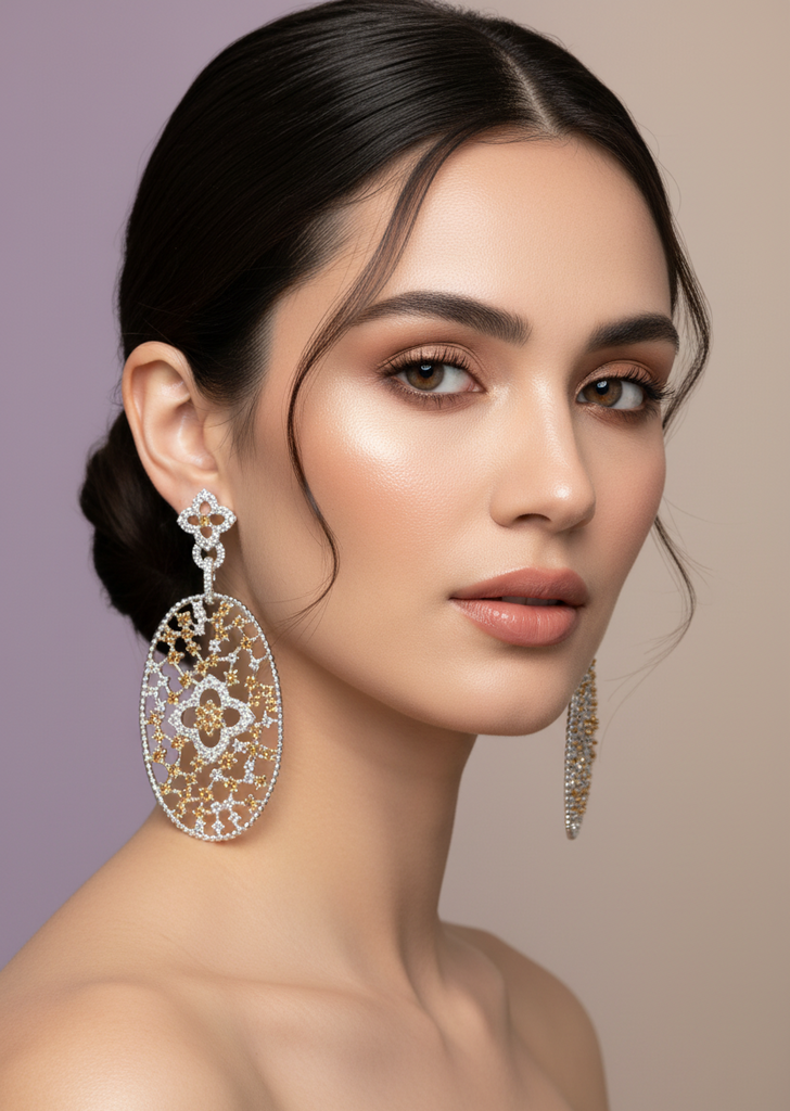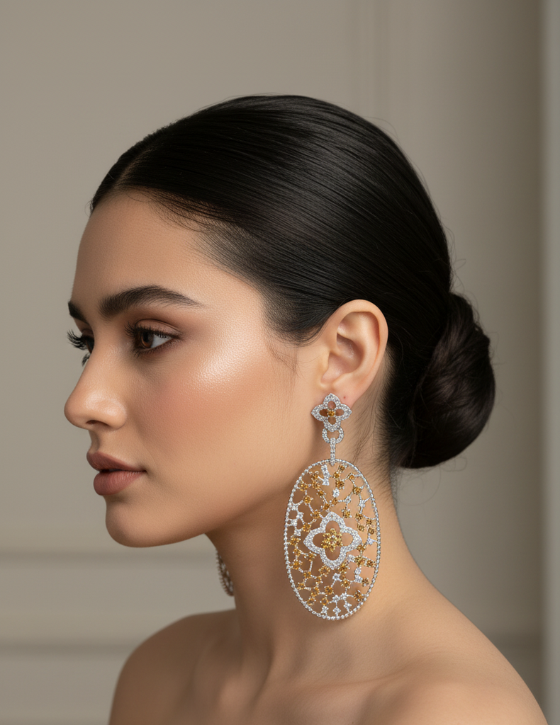 High quality rhodium plated earrings studded with precious zircons and real stones.