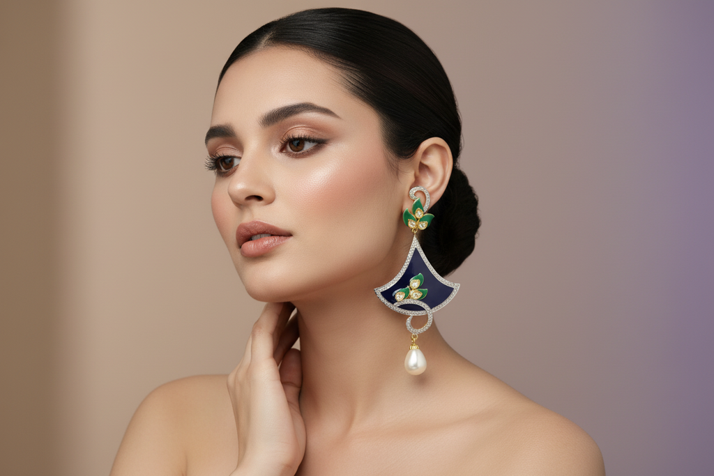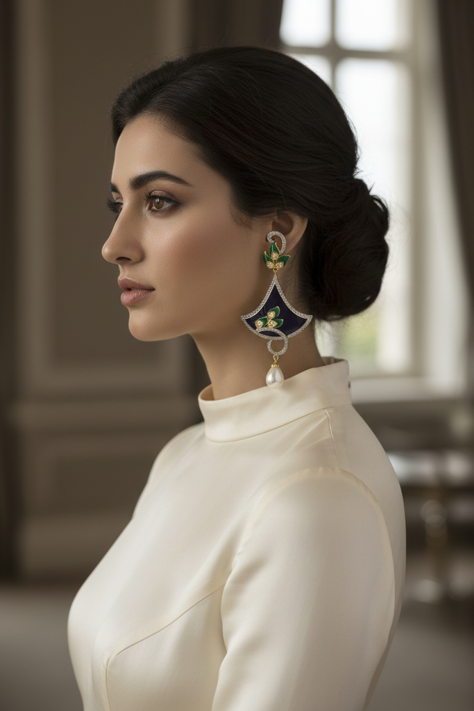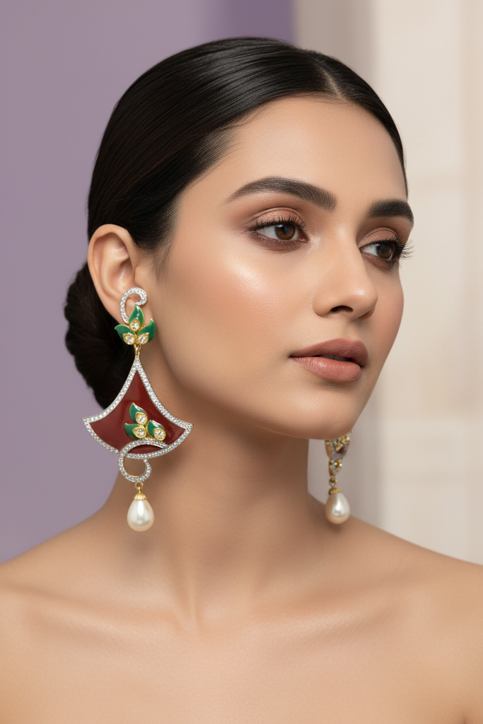 High quality gold + rhodium plated meena kari earrings studded with precious zircons and real stones.