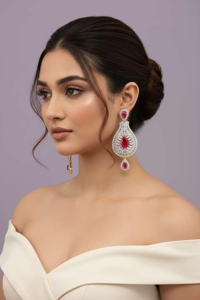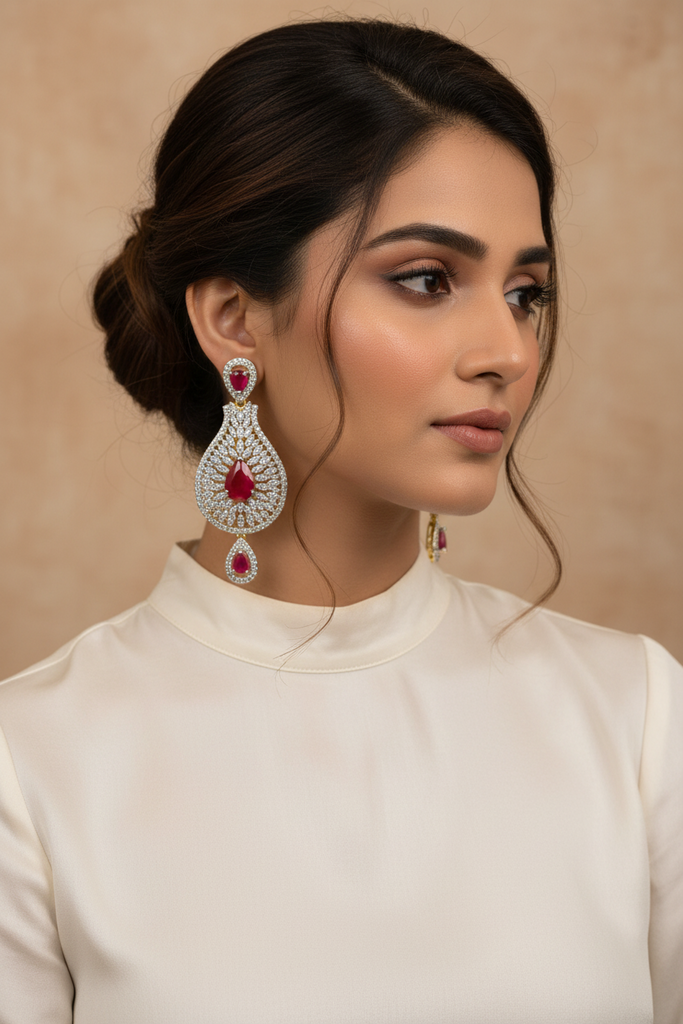 High quality gold + rhodium plated earrings studded with precious micro zircons and real stones.