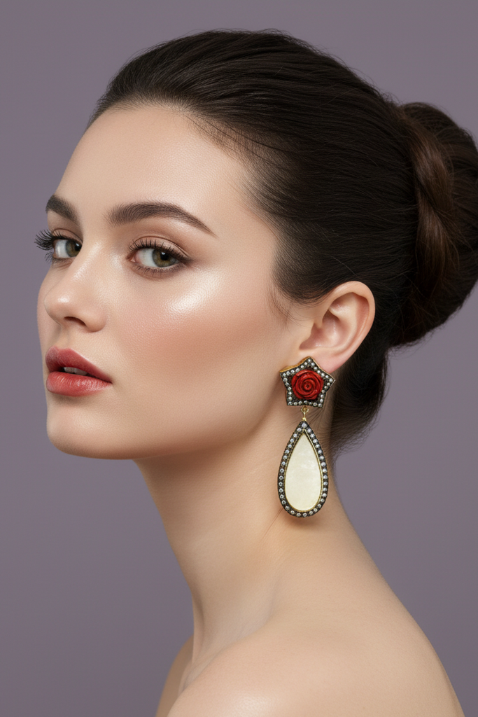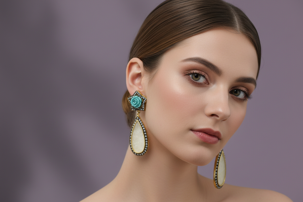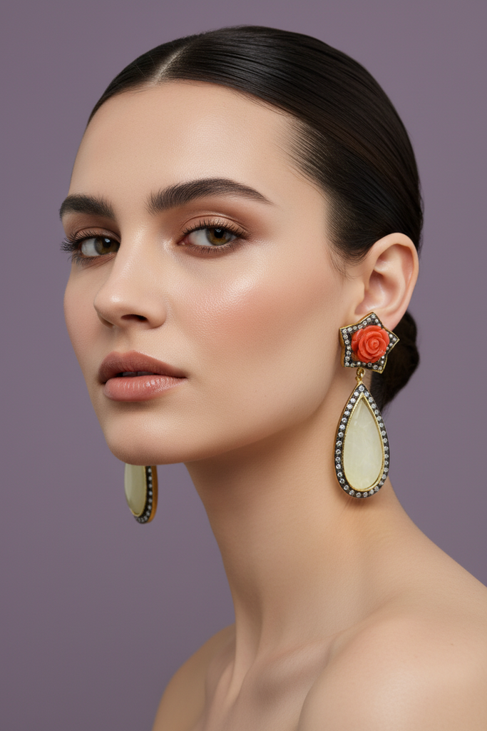 High quality gold +rhodium plated Italian earrings studded with precious zircons and real stones.