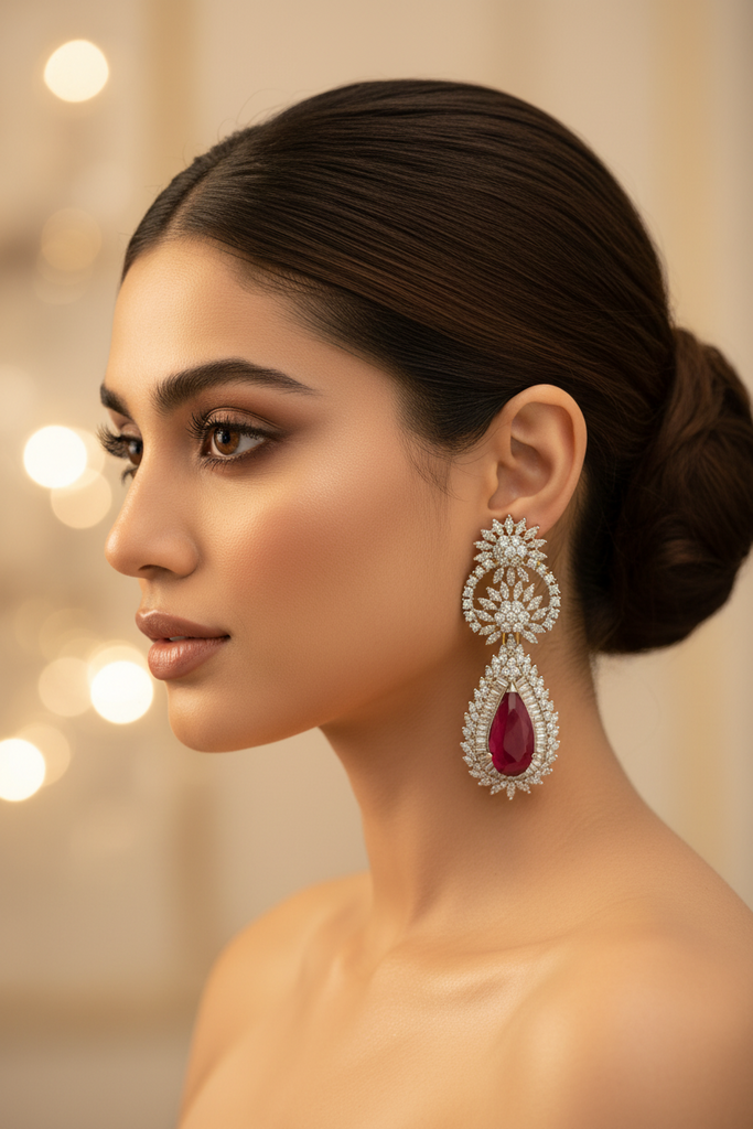 High quality gold + rhodium plated earrings studded with precious zircons and real stones.