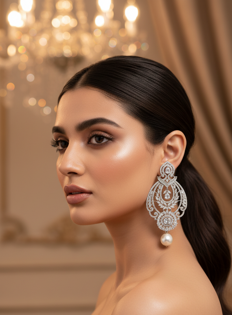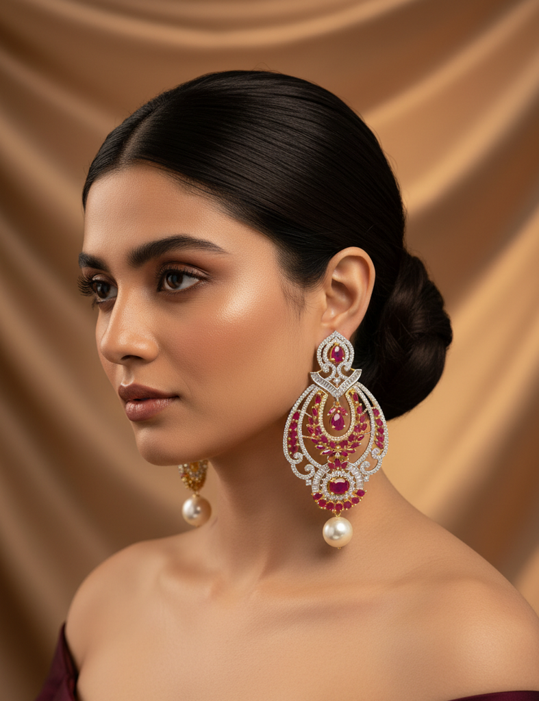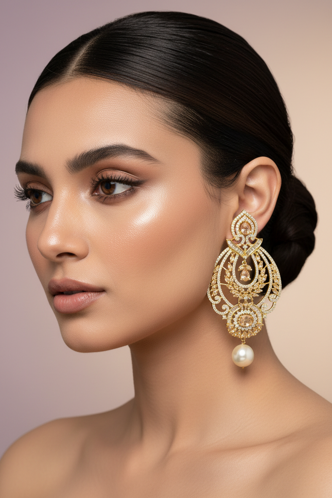 High quality gold + rhodium plated earrings studded with precious zircons and real stones.