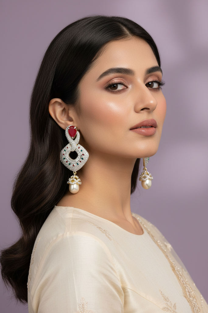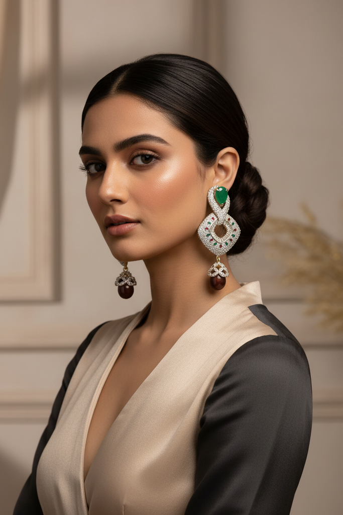 High quality gold +rhodium plated earrings studded with precious zircons and real stones.