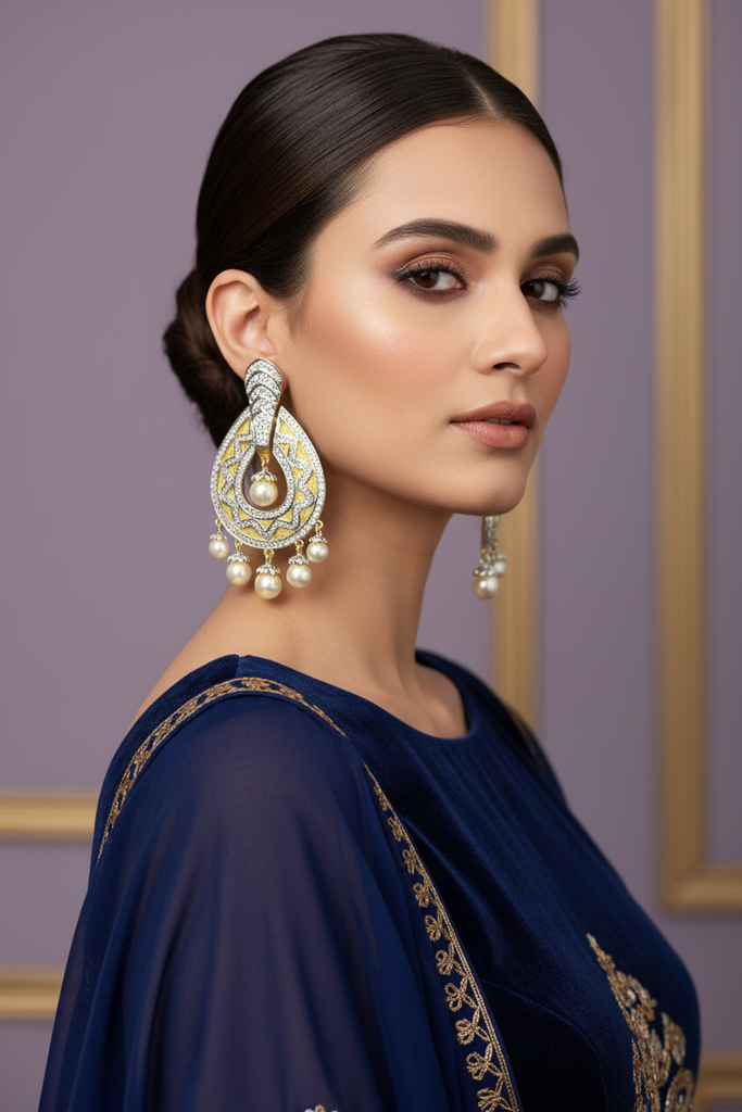 High quality gold + rhodium plated earrings studded with precious zircons and real pearls.
