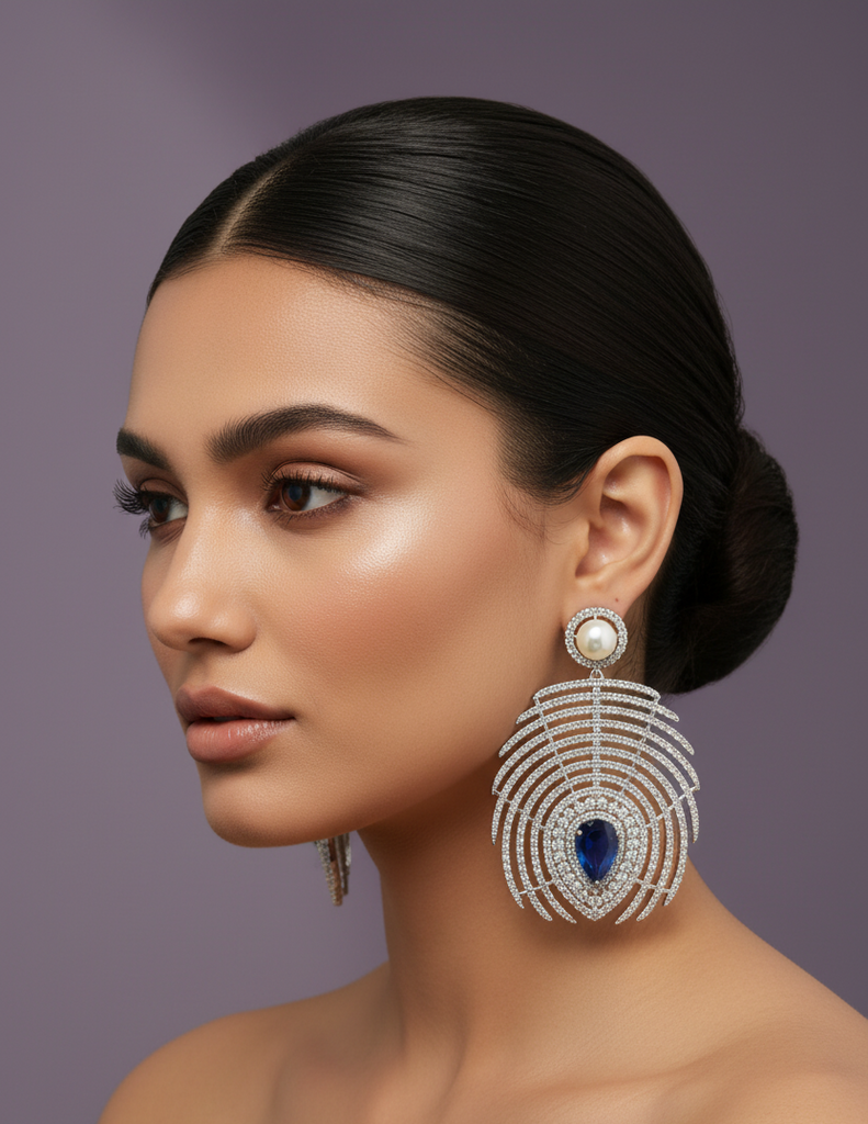 High quality rhodium plated earrings studded with precious micro zircons and real stones.