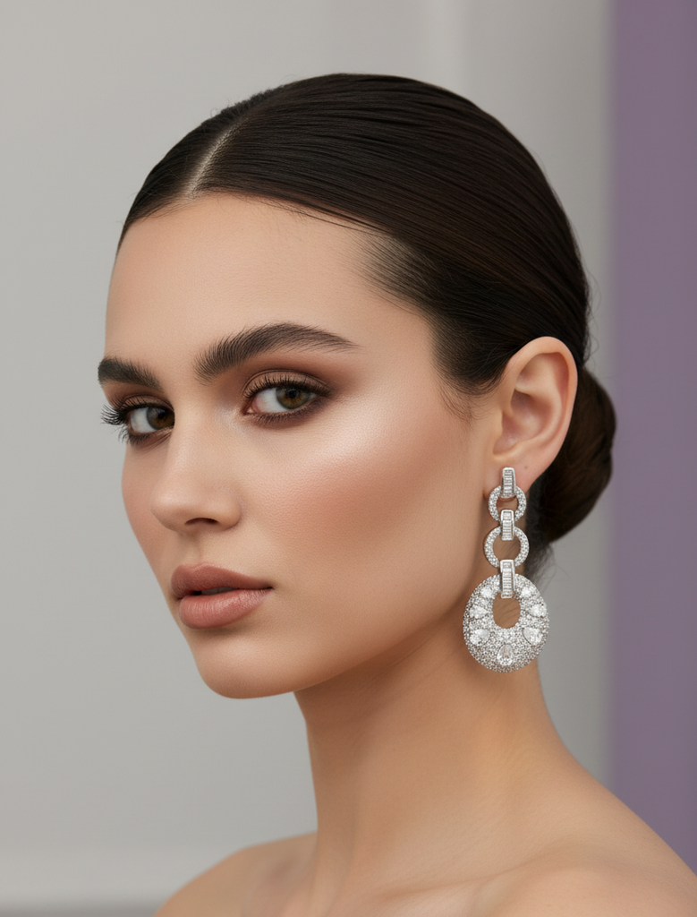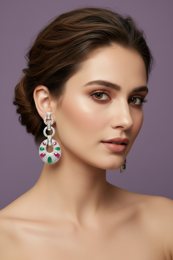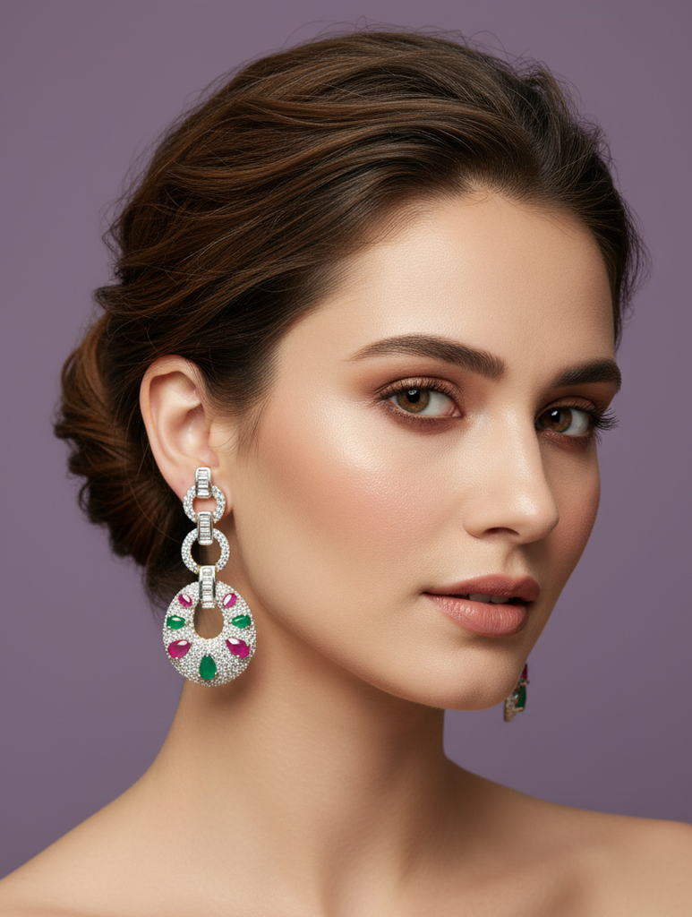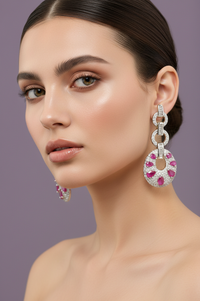 High quality rhodium plated earrings studded with precious zircons and real stones.