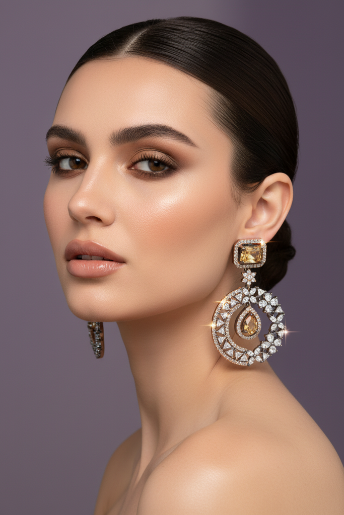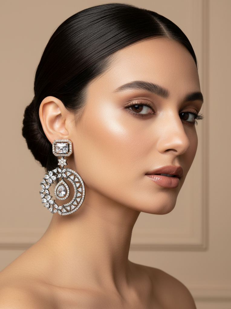 High quality rose gold + rhodium plated earrings studded with precious zircons and real stones.