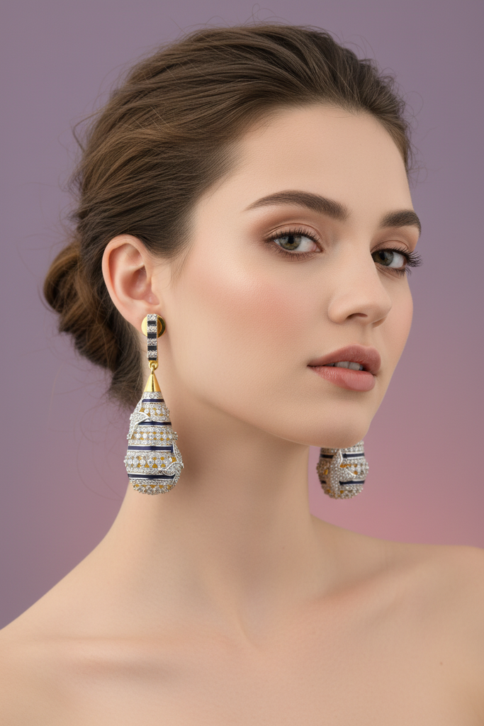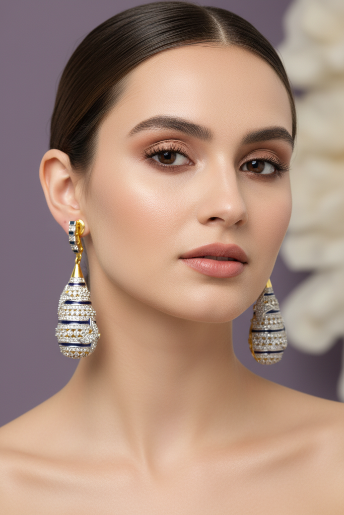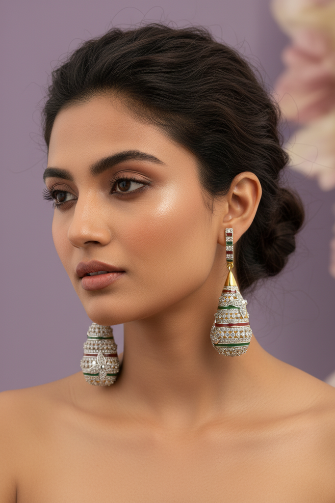 High quality gold +rhodium plated Meena Kari Double Casted earrings studded with precious zircons.