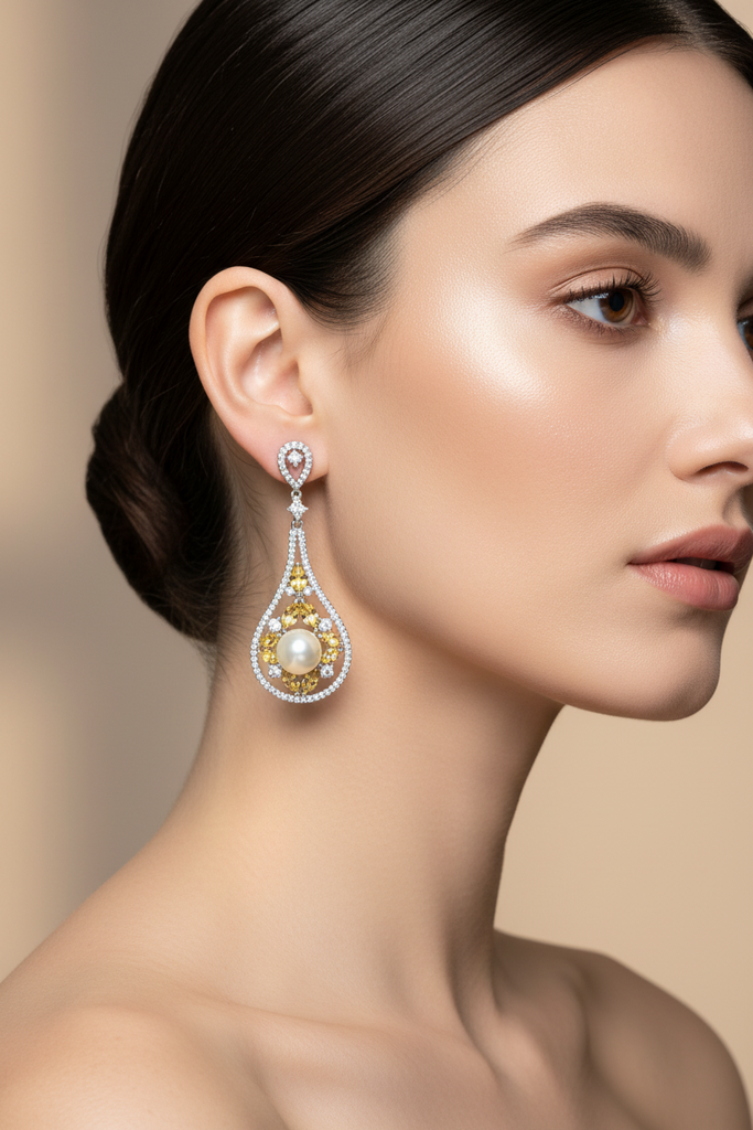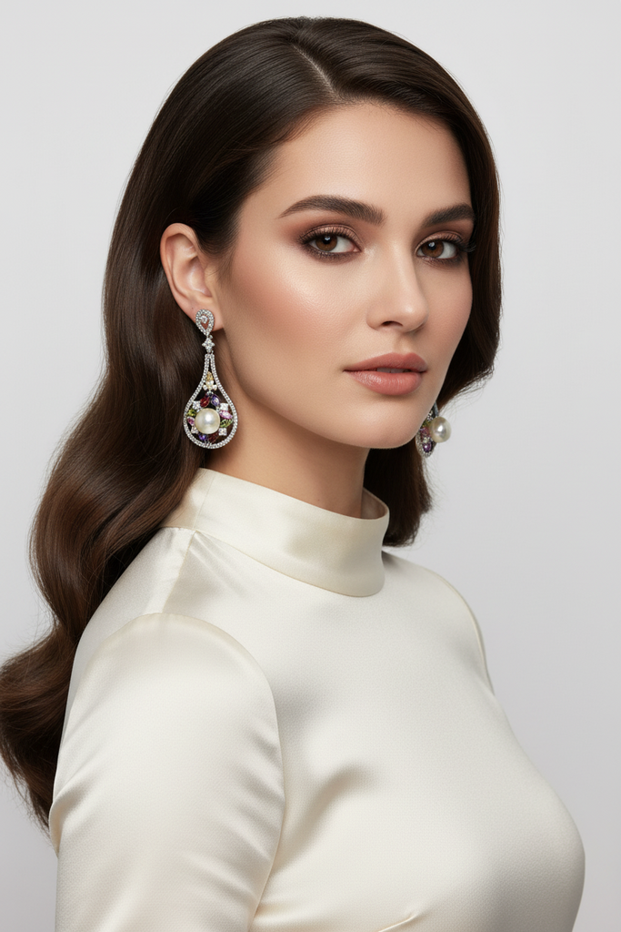 High quality rhodium plated earrings studded with precious zircons and real stones.