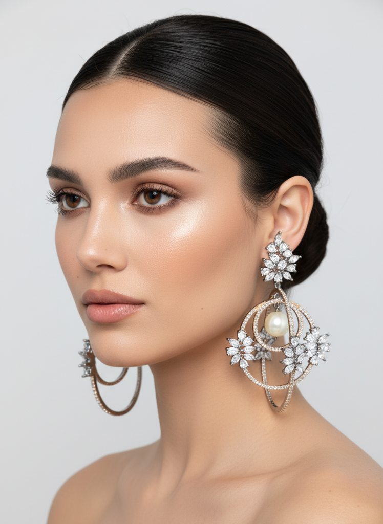 High quality rhodium plated + rose gold polish earrings studded with precious zircons and stones.