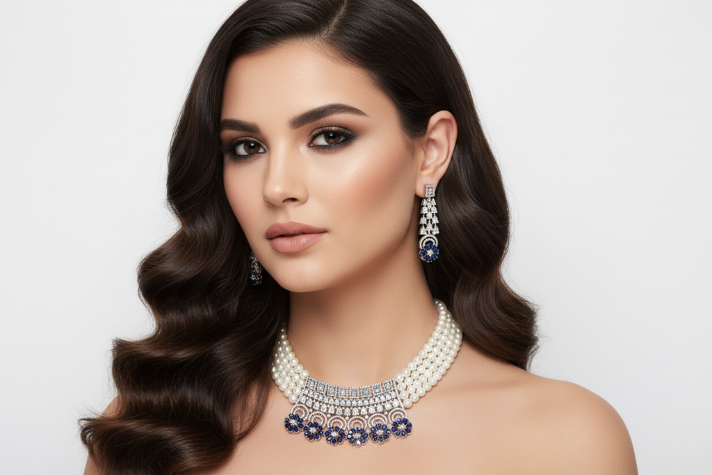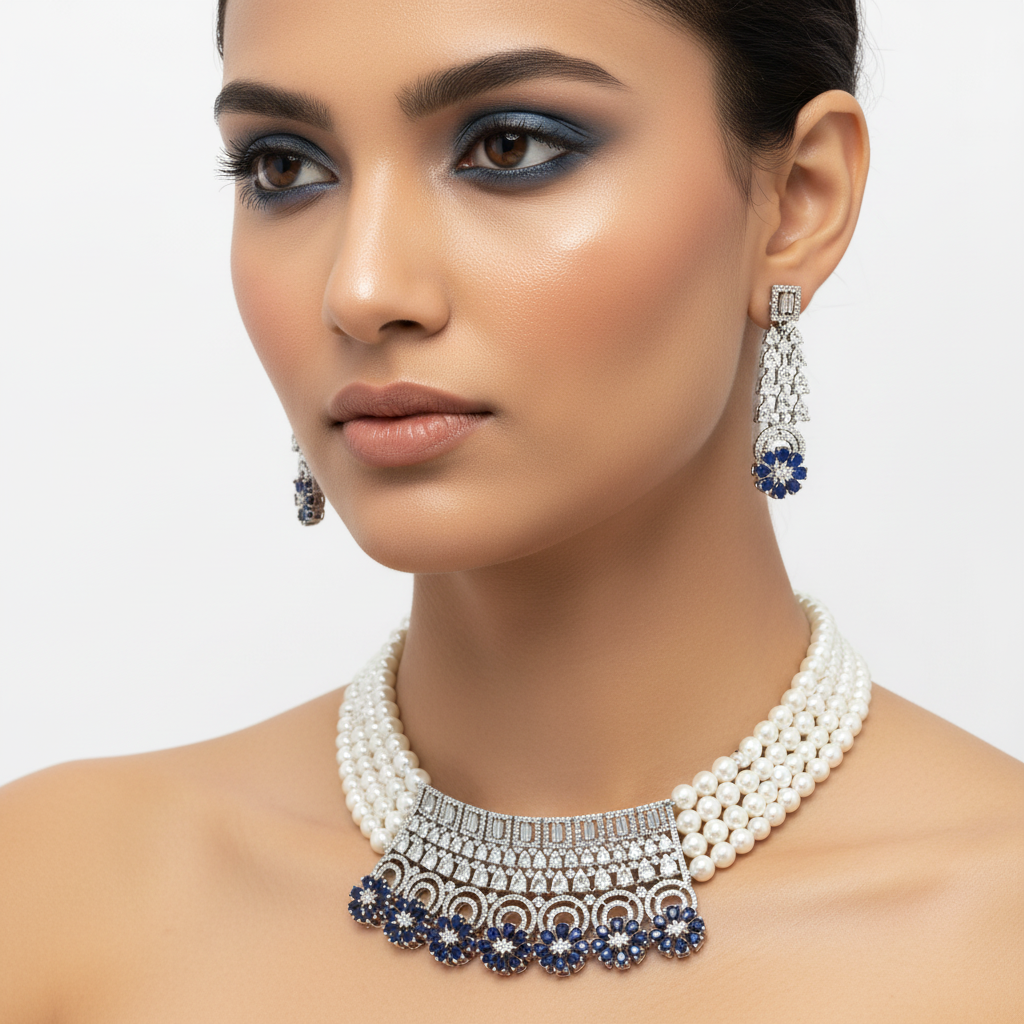 High quality rhodium plated very beautiful and elegant necklace choker patti set studded with precious zircons and stones.