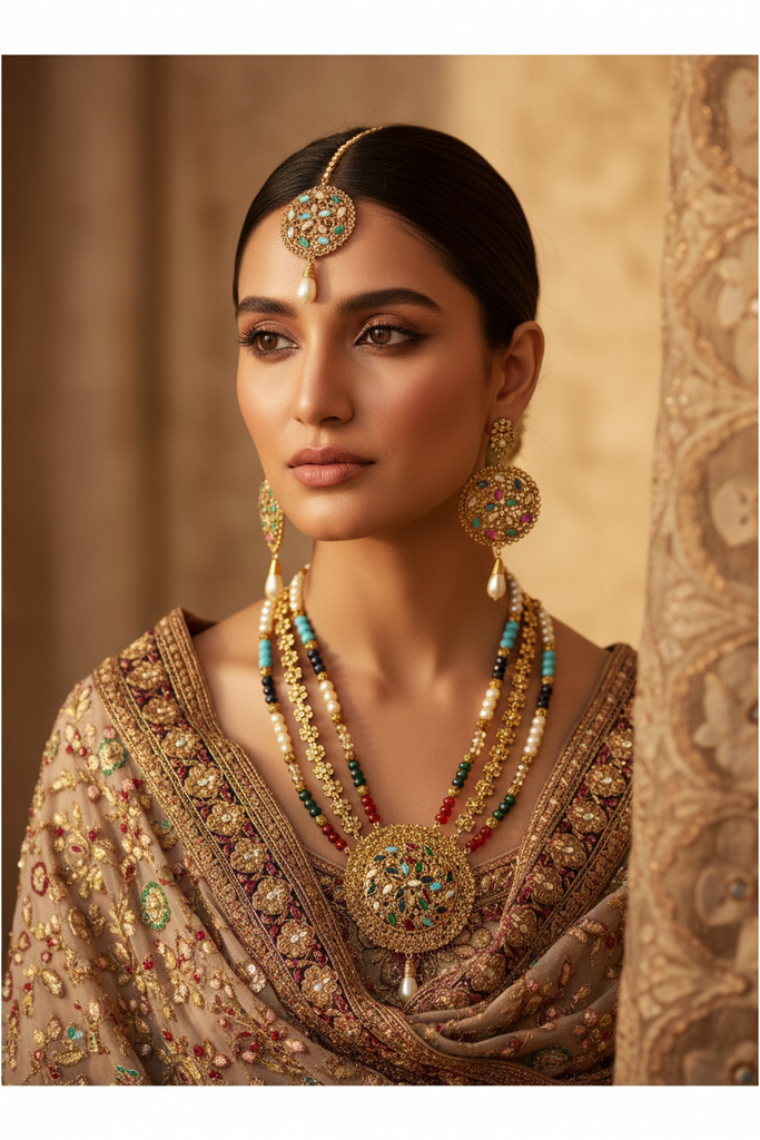 22k high quality gold plated bridal maala set studded with real champagne polki and real stones.