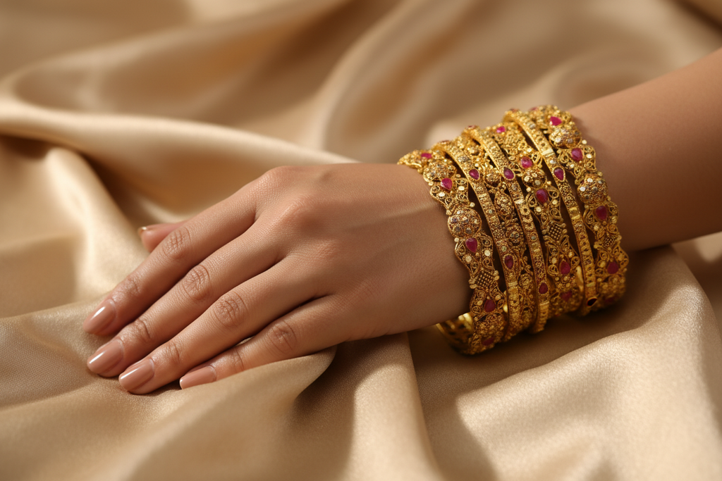 22k high quality gold plated high quality traditional bangle set studded with real stones.
