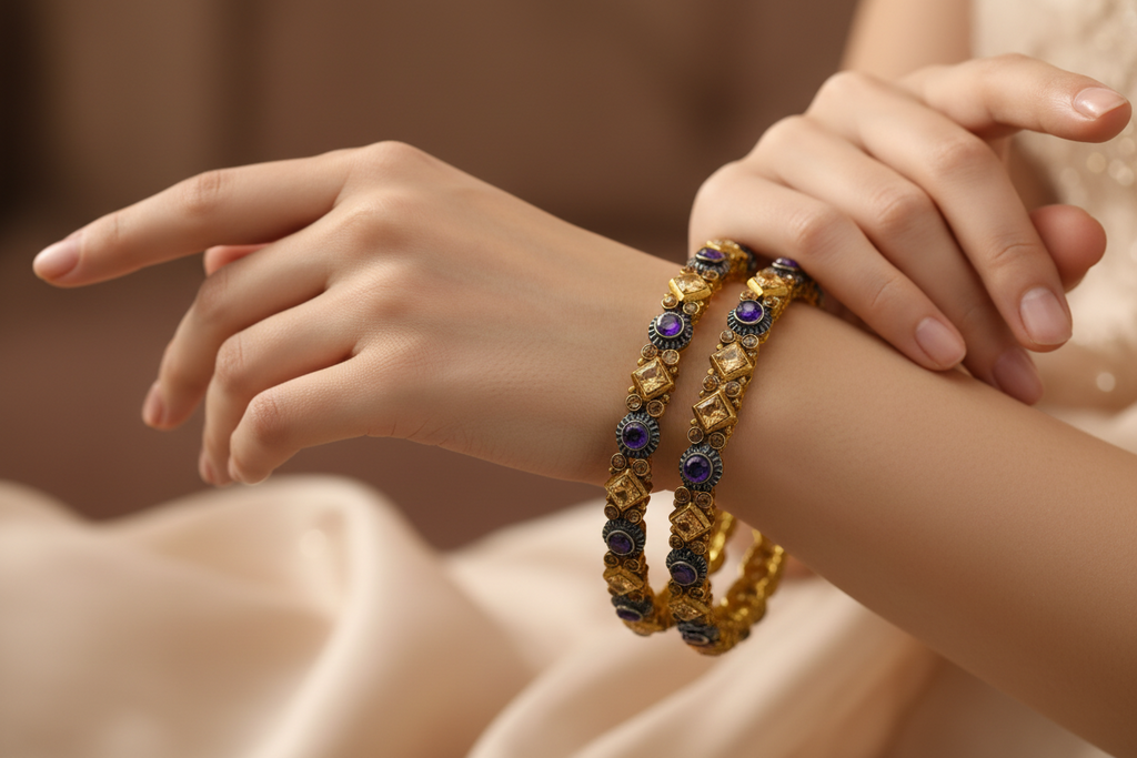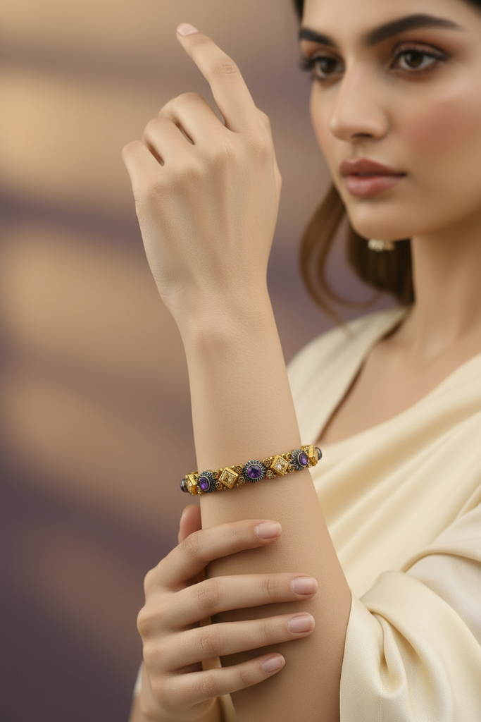 22k high quality gold + rhodium plated hand crafted bangle studded with real stones.