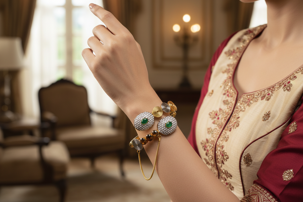 22k high quality gold + rhodium plated high quality signature bangle studded with real stones.