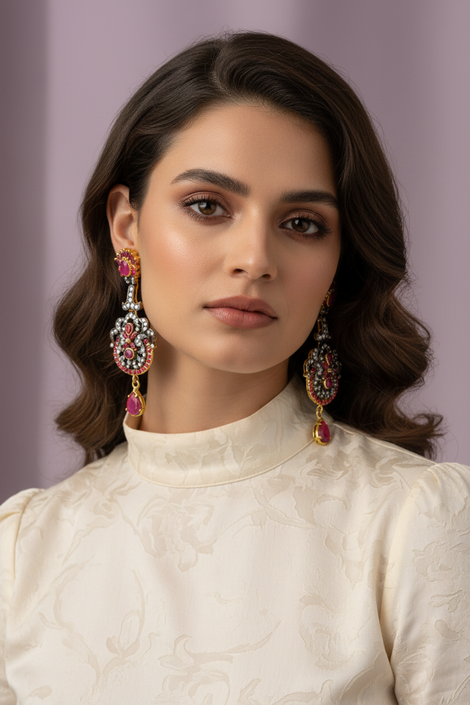 22k gold + rhodium plated earrings studded with precious zircons and stones.