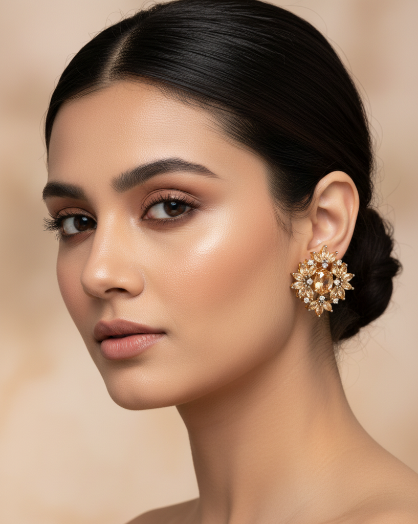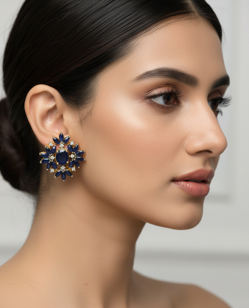 22K gold + rhodium plated earrings studded with precious zircons and stones.
