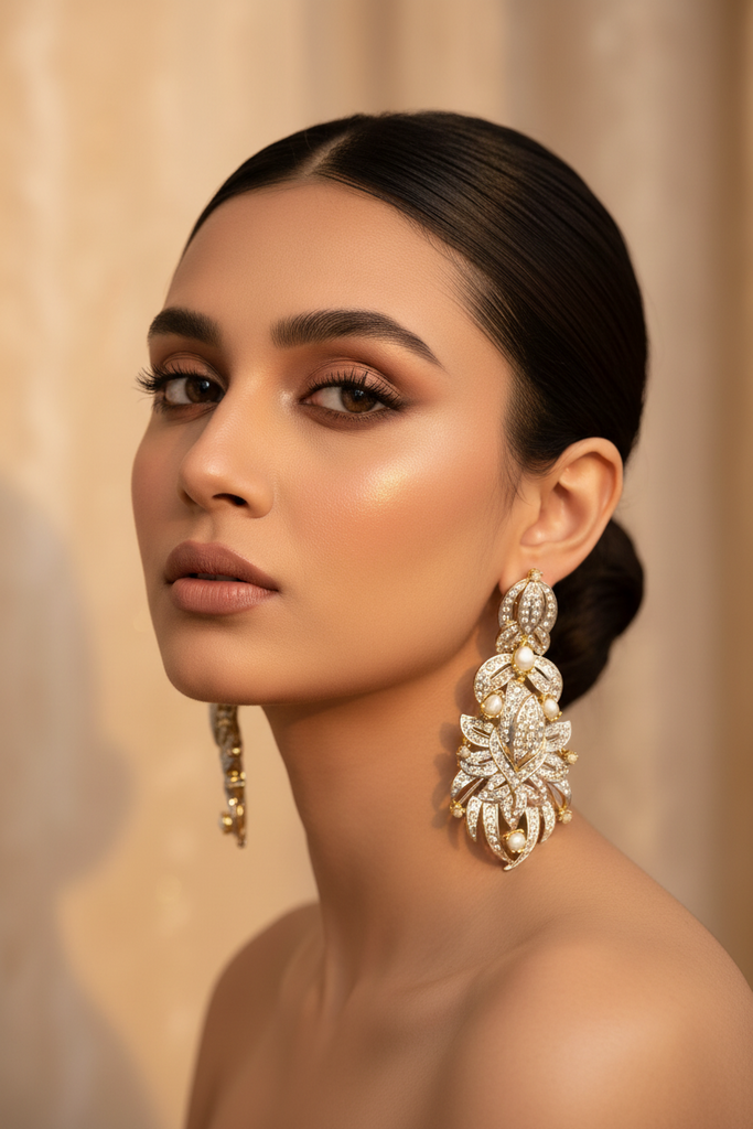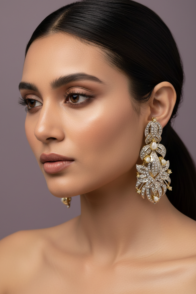 22k gold + rhodium plated earrings studded with precious zircons and stones.