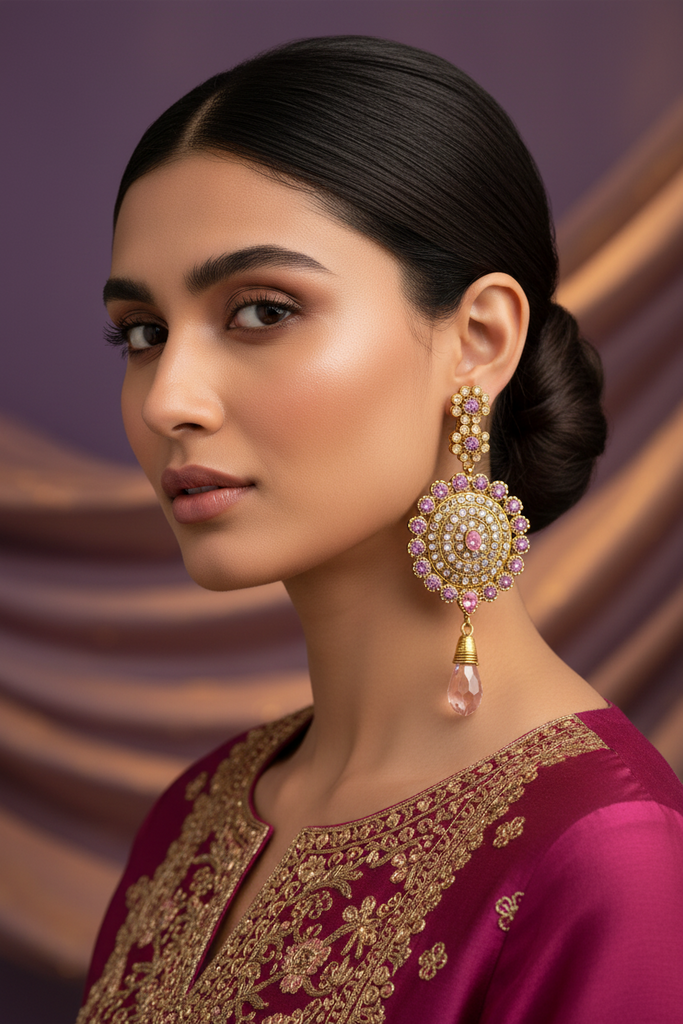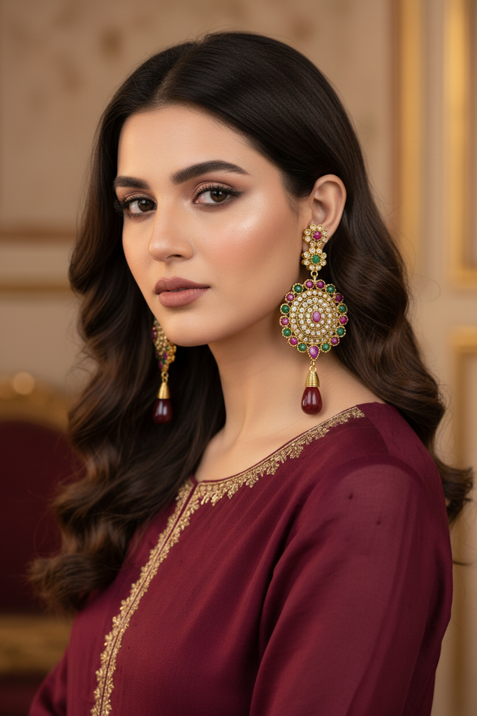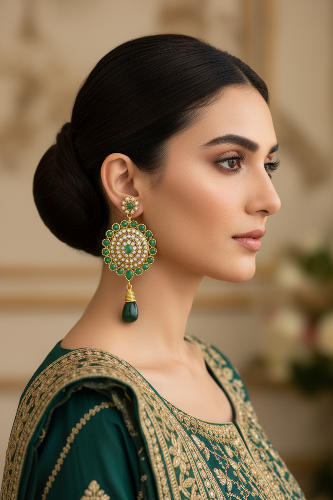 22k gold + rhodium plated hanging earrings studded with real polki and stones.