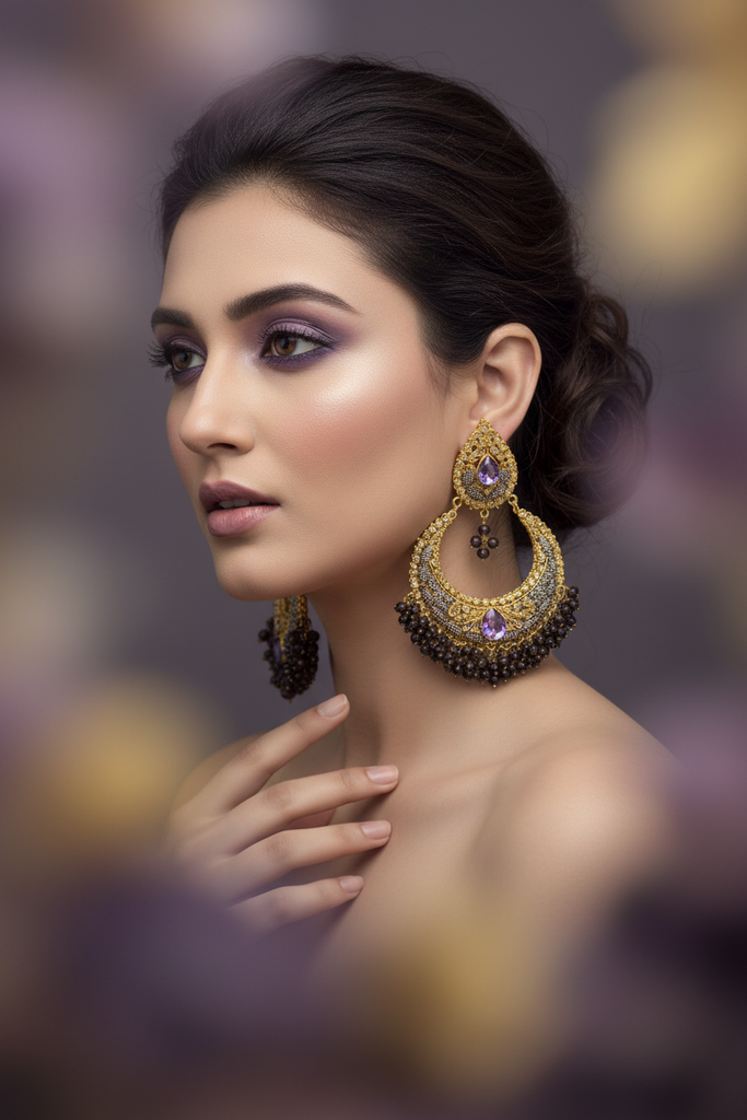 22K gold platted chaand baali studded with real stones.