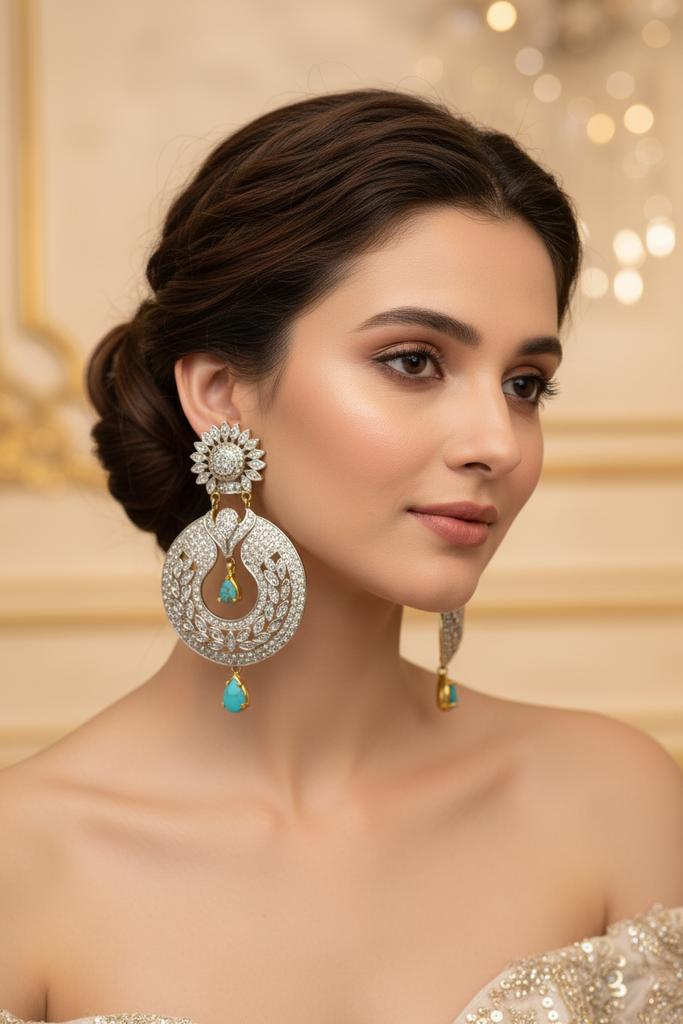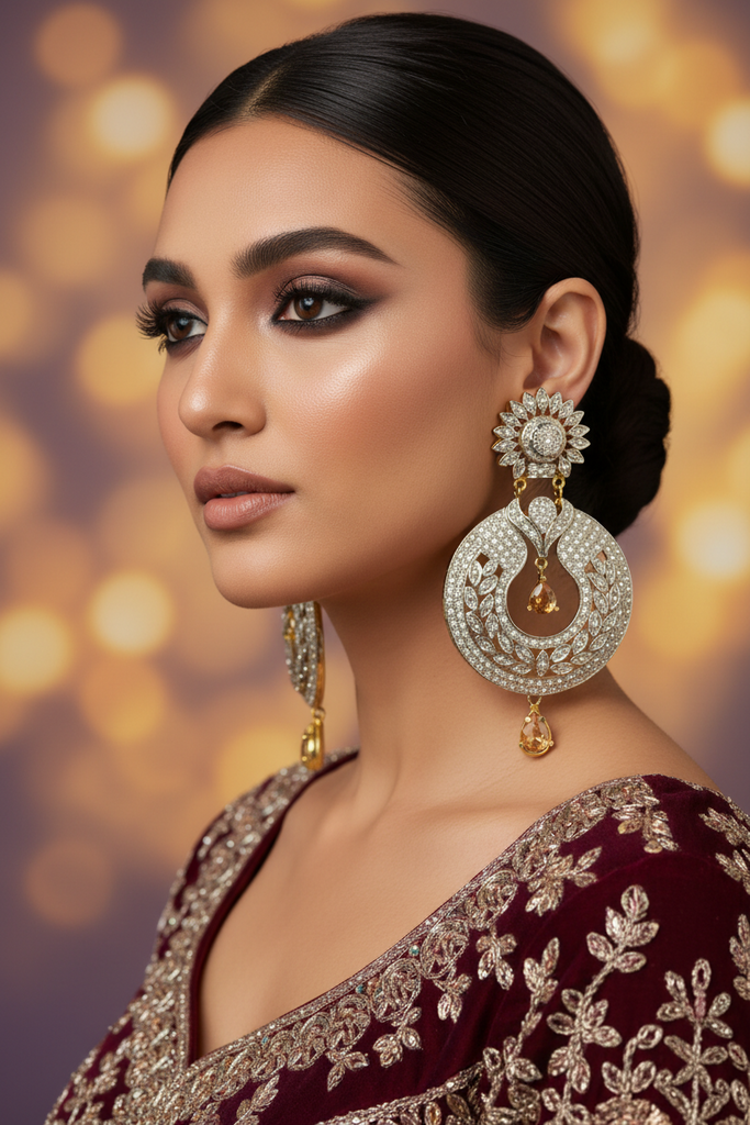 22k gold + rhodium plated chaand baali studded with precious zircons and stones.