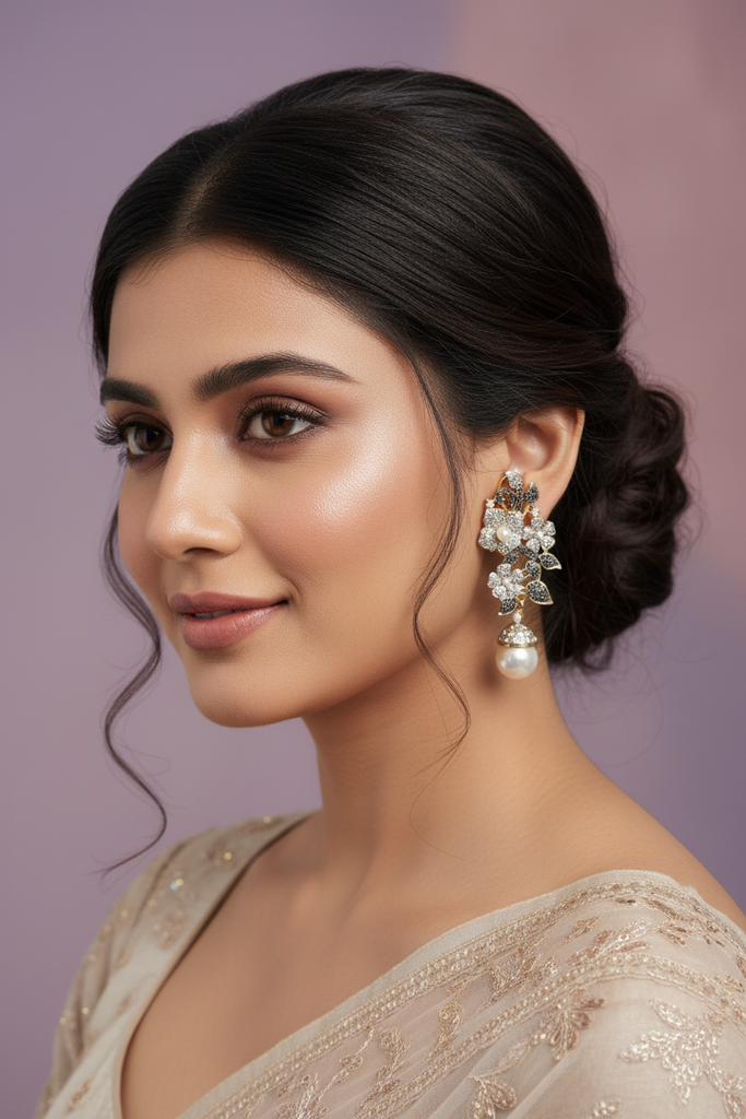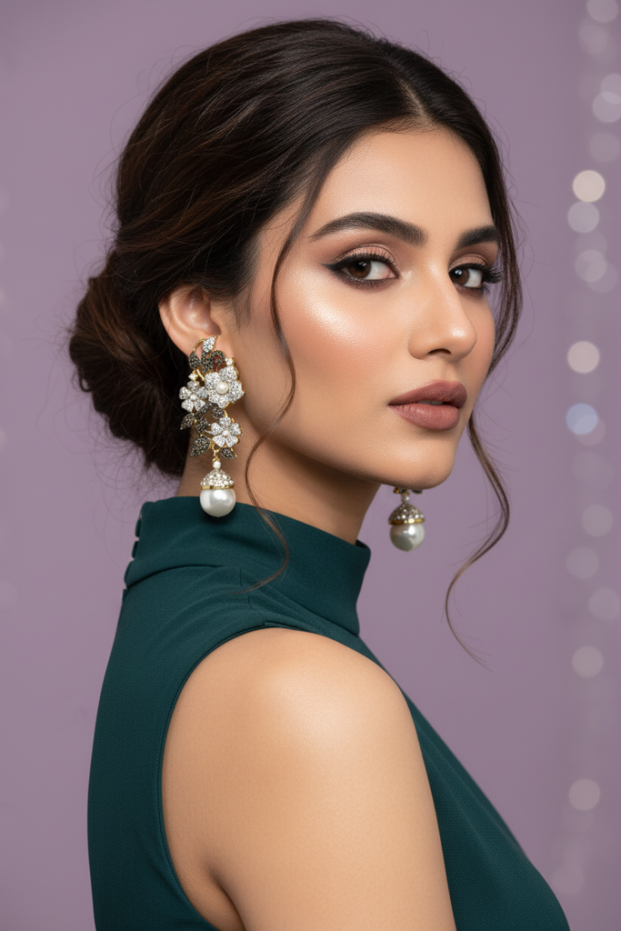 22k gold + rhodium plated traditional jhumki studded with precious zircons and real stones.