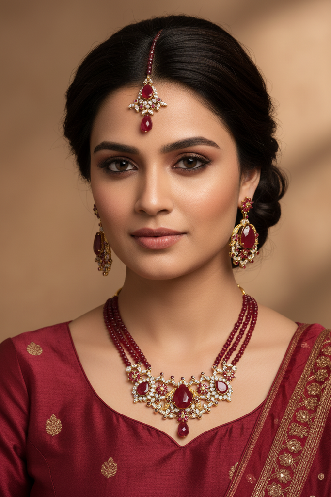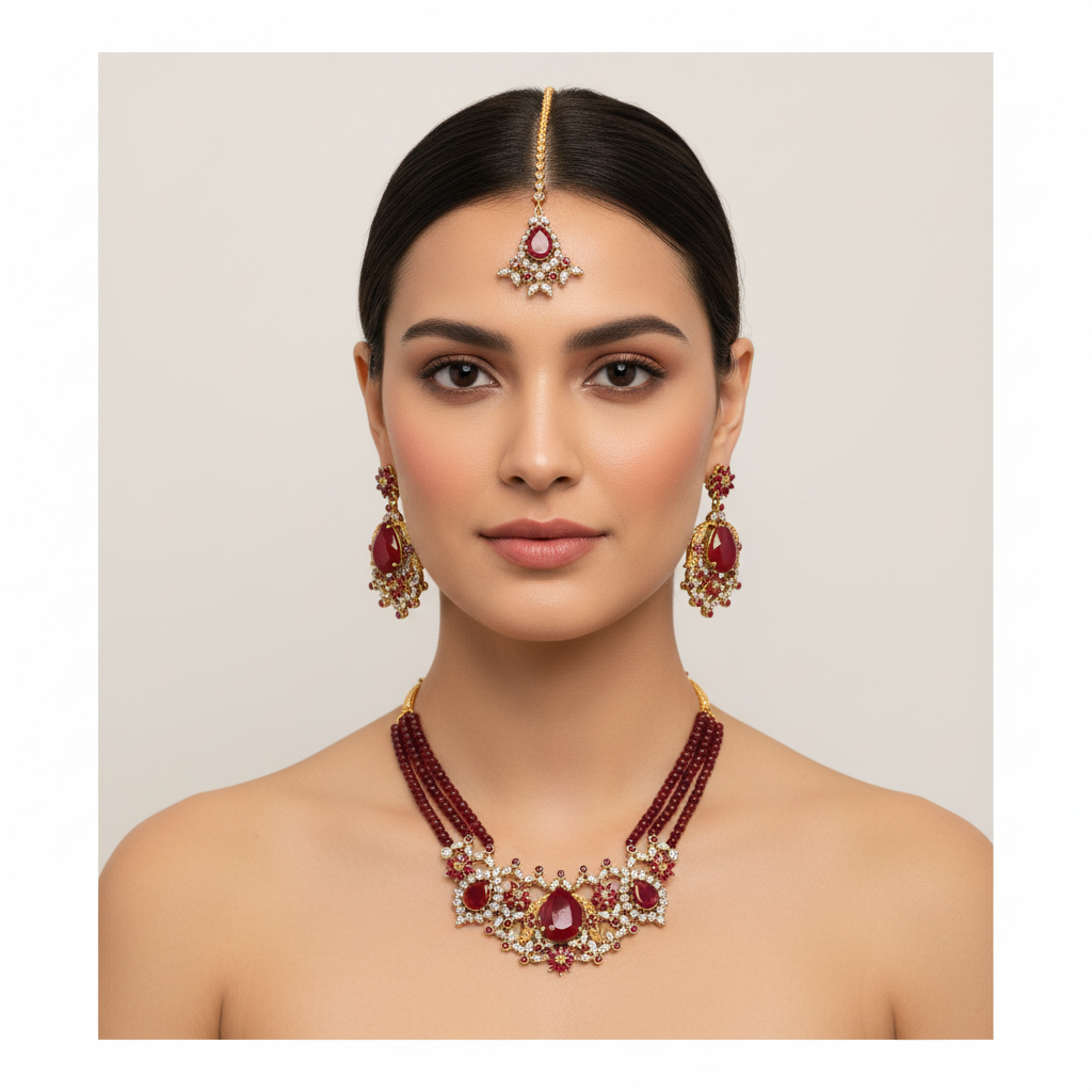 22k high quality gold + rhodium plated two tone necklace set studded with precious zircons and stones and precious ruby beads.