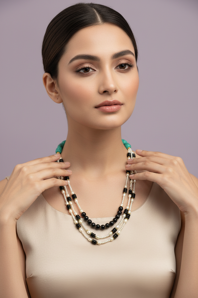 Premium quality long length Mala studded with real pearls and real feroza, black onyx beads.