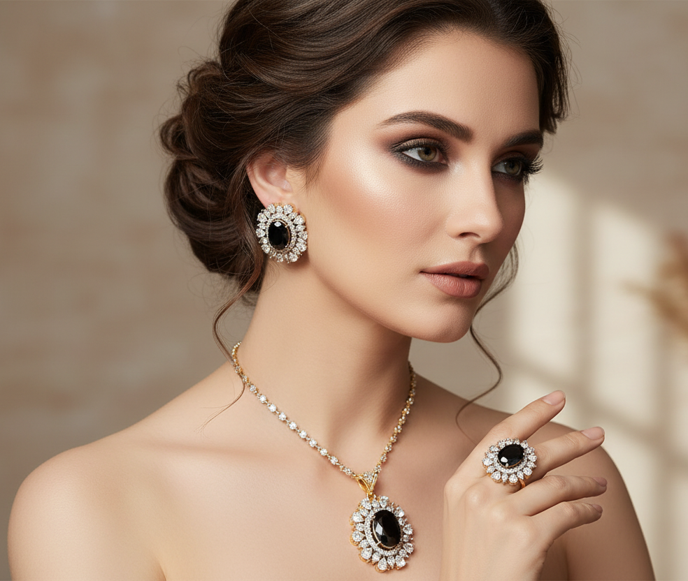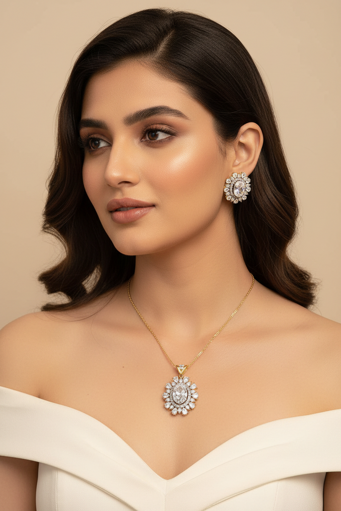 22k high quality gold + rhodium plated diamond cut pendant set studded with real precious zircons and real stones