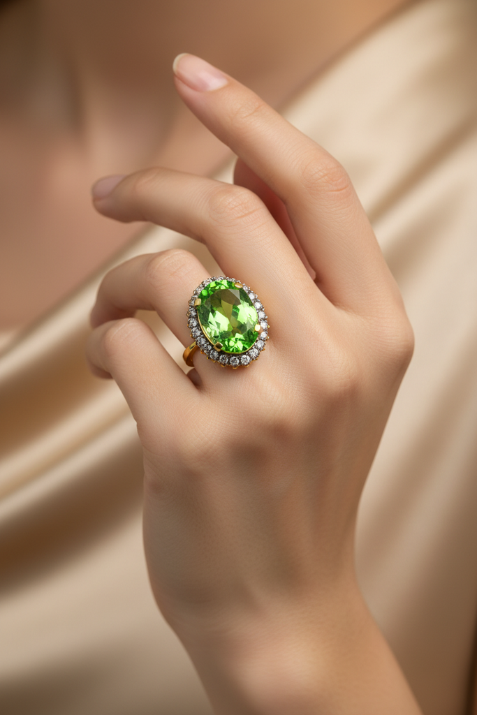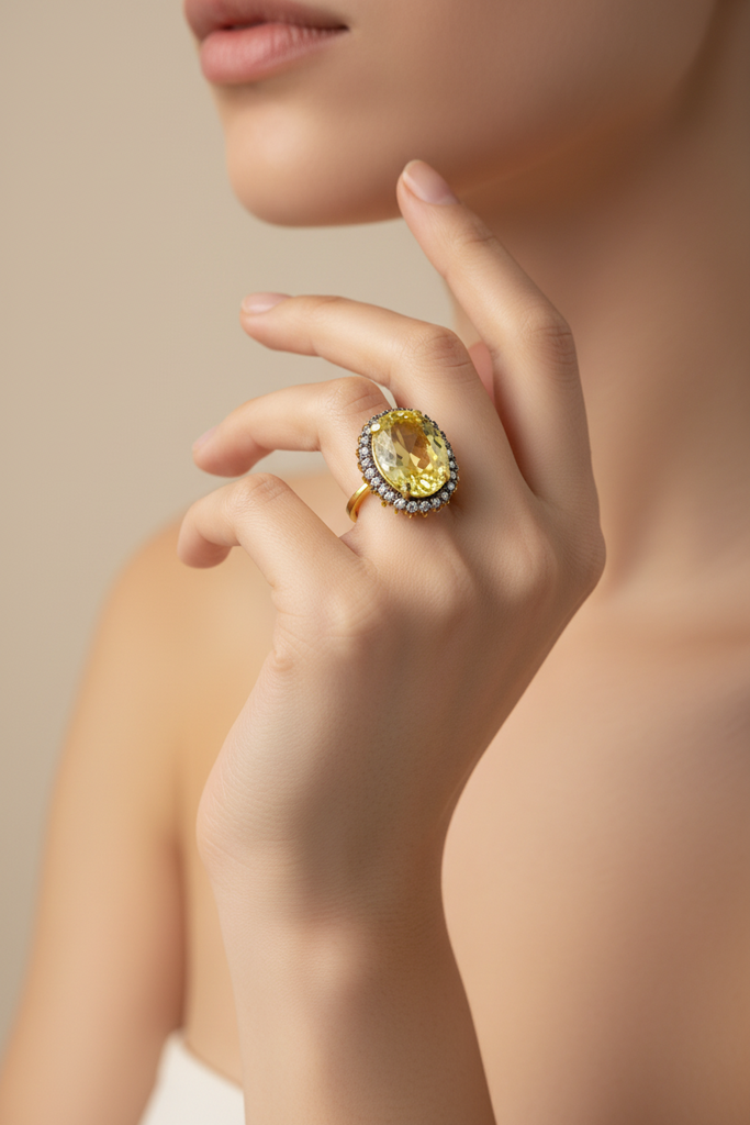 22k gold + rhodium plated diamond cut ring studded with precious zircons and real stones.