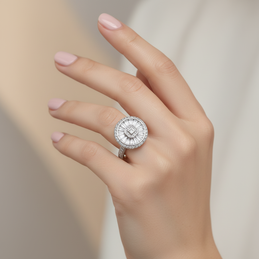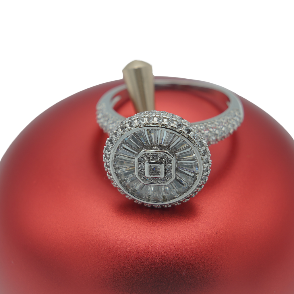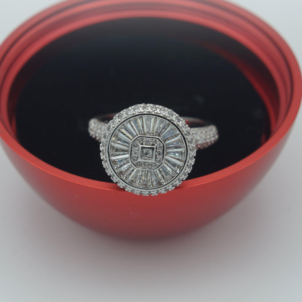 High quality rodhium plated premium quality ring studded with real precious zircons and taper zircons