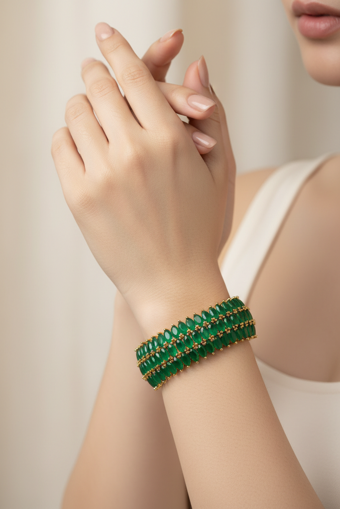 High quality gold plated very elegant open able bangle studded with real emerald stones. Premium quality👍