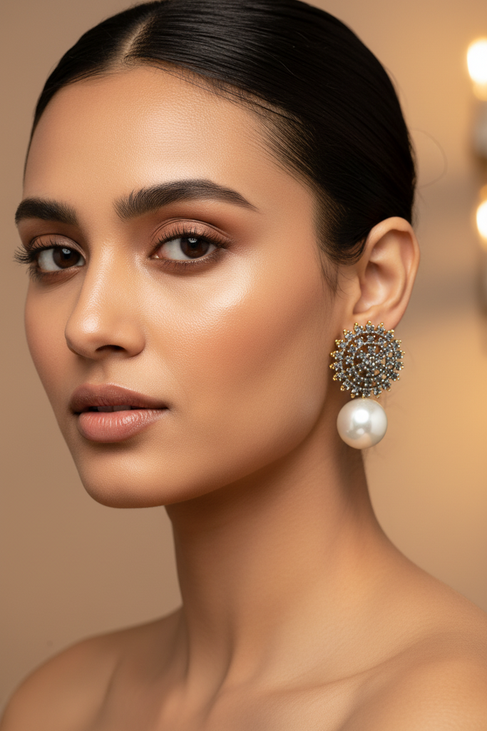 22k gold + rhodium plated high quality medium size diamond cut earrings studded with precious zircons and real pearls.