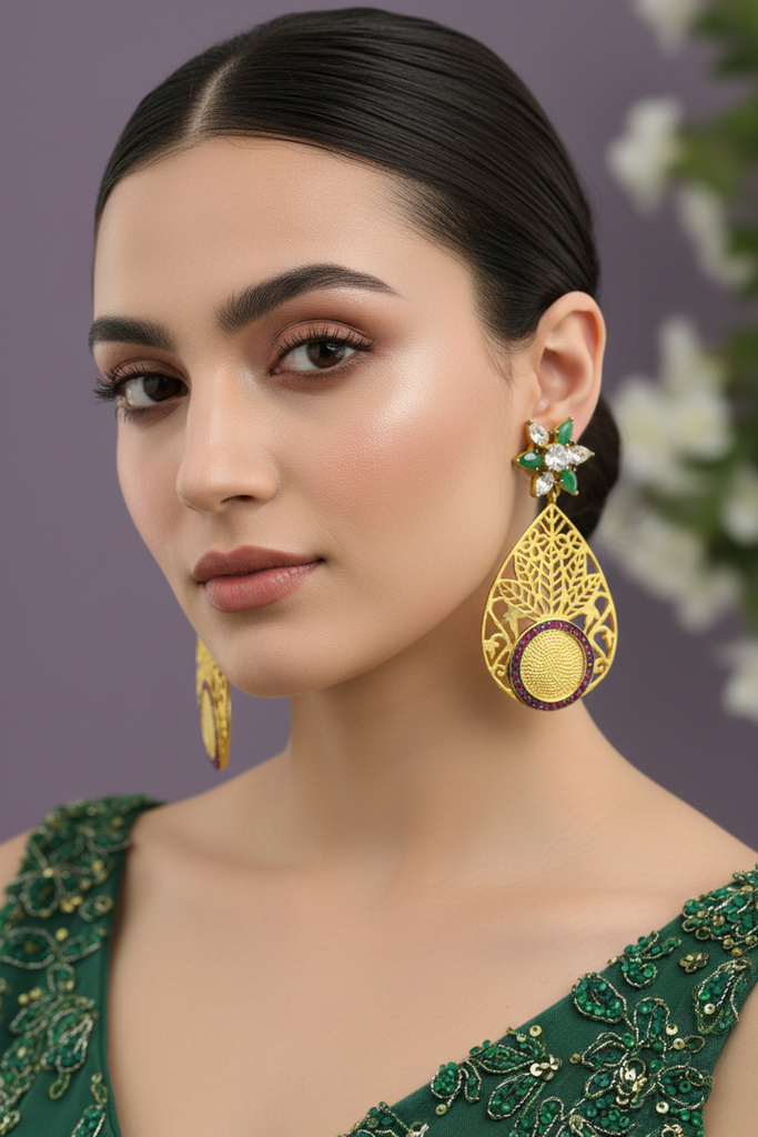 High quality gold + rhodium plated earrings studded with precious micro zircons and real stones.